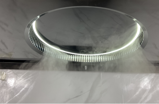 再使用煙霧鍋制造油煙逸散的場景。首先,打開水霧鍋,讓水霧擴散,模擬出廚房油煙環繞的效果,然后開啟德意○宇宙油煙機。