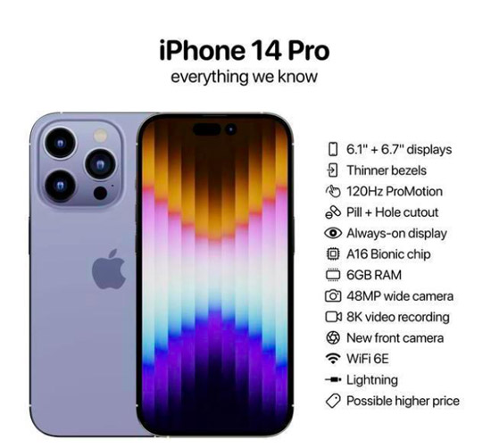 當然,此次針對iPhone14Pro的升級不僅在于芯片的使用上,據目前多個媒體暴露的信息來看,iPhone14Pro將拋棄劉海屏轉向打孔屏、內存升至8GB、相機像素升至4800萬、更多的配色、更長的續航等等。