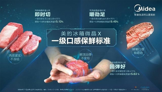聚焦肉類保鮮難題和口感體驗,美的冰箱2018年正式發布行業首創的“微晶一周鮮”技術,以“7天不凍原鮮,口感如初”顛覆肉類保鮮體驗。2022年,美的冰箱微晶X上市,該產品搭載新升級的微晶一周鮮科技,新增水產模式,通過毫秒級雷達感溫、V-TECH智能云保鮮、柔和環抱送風,將食材個性化智慧保鮮能力持續完善,為用戶帶來一級的原鮮口感。美的冰箱微晶X在口感保鮮上的極致引領,使得疫后囤貨需求下的消費者,也依然能臻享原鮮如初、營養不流失的美食體驗。