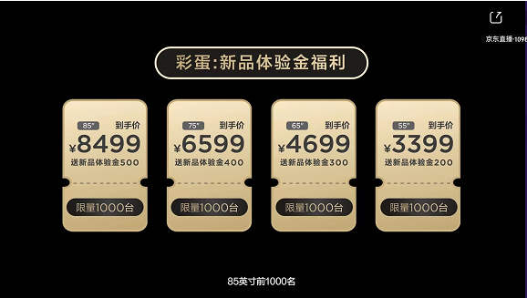 目前,TCL T7G電光藍真高刷電視II已經開始預售,8⽉26⽇晚8點正式開售。新品首發期,每個尺寸段前1000名預定用戶將贈送500元、400元、300元和200元新品體驗金,最終到手價分別為8499元、6599元、4699元和3399元。