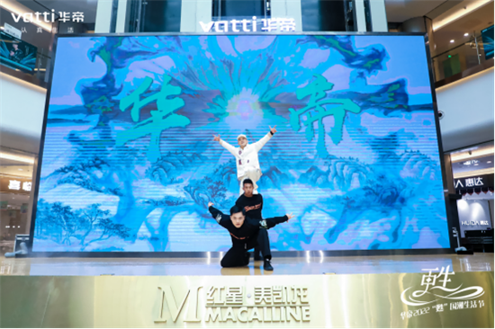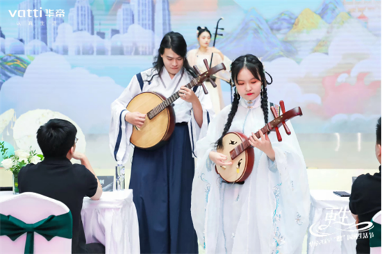 活動現場,三位表演者身著古典華服,為觀眾帶來了由中阮、二胡中國傳統樂器演奏的《蘭亭訊》、《云宮迅音》和《萬疆》,表演者隨著歌曲節奏的變化極速輪轉,行云流水一般的彈奏技藝,從周杰倫《蘭亭序》里的中式愛情到《萬疆》獻禮祖國,展現出華帝將古風與國潮結合帶來的魅力。