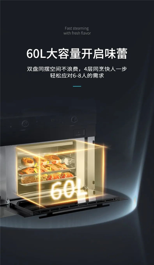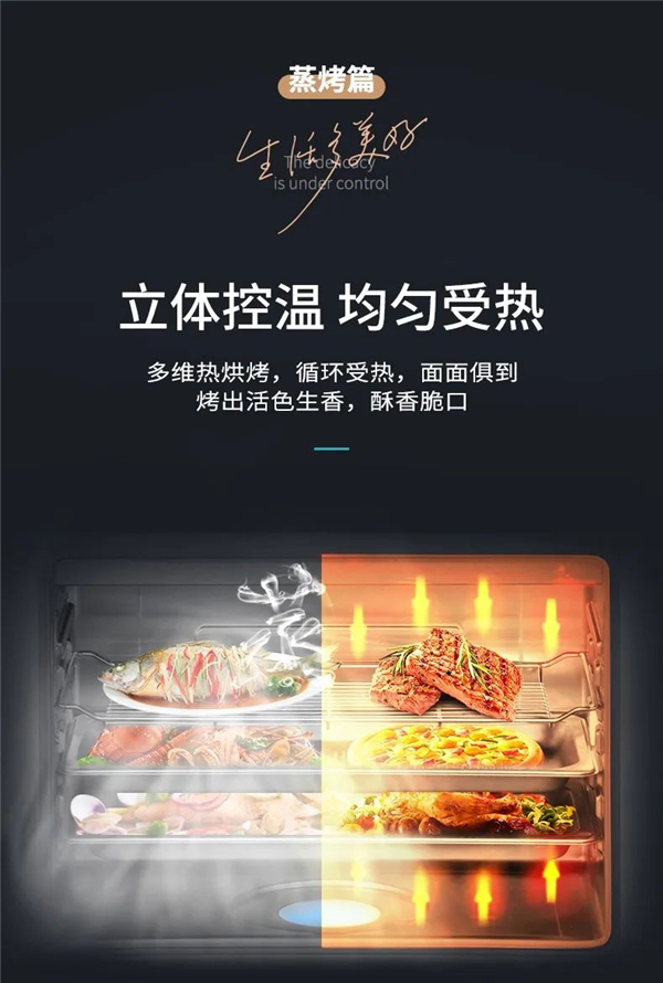 360度蒸汽動態平衡下的“蒸“,高溫蒸汽迅速噴涌至蒸烤箱內部,包裹食材鎖住營養,確保美味不打折扣。5D立體熱風循環下的”烤“,多維熱烘烤循環對食材進行受熱,面面俱到烤出活色生香,一口酥香可口。