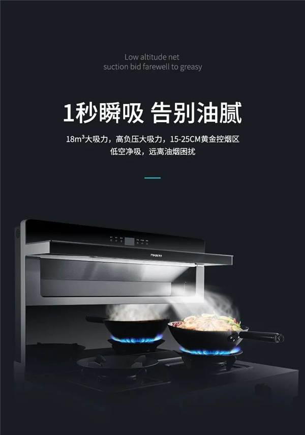 美多M15S語音蒸烤一體集成灶電機高效運轉,500pa大風壓加18m3/min的持久大吸力讓油煙源源不斷涌入煙機內部,炒菜時再也不用擔心油煙的干擾。
