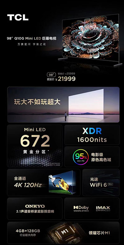 本次新品發布會上,TCL產品經理分享了TCL在大屏和MiniLED方面的技術儲備與行業地位。TCL不僅是國內最早布局、首家量產MiniLED電視的品牌,更保持著對市場的敏銳嗅覺以及對用戶需求的持續關注;貧w產品本身,TCL98Q10GMiniLED巨幕電視,在背光、亮度、控光技術等方面都帶來大幅度提升,672黃金分區MiniLED技術,相較普通256分區同尺寸產品,分區數量更多,控光精細度提升2.6倍。夜空幽邃、燈火明晰、各種色彩如身臨其境般生動精準,每次觀影,都是一場視覺盛宴。