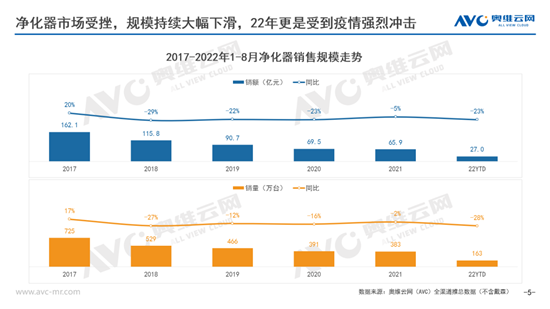其實從空氣凈化器的發展歷程上可以窺探一二。凈化器行業近10年的發展分為4個階段。第一階段,13年借著霧霾經濟的東風,凈化器行業乘風而起,快速擴容的同時,也帶來了一些亂象,各種品牌層出不窮,行業野蠻生長。第二階段,2016年出臺新標準,將不合格產品逐漸淘汰,大量品牌退出,行業被重新洗牌。第三階段,2018年6月,國家發布打贏藍天保衛戰三年行動計劃,霧霾經濟迅速迎來終結,也促使凈化器功能升級迭代,行業內部快速將目光轉向當時還比較火熱的房地產行業,凈化器也和除甲醛深度綁定。第四階段,21年至今,房地產行業開始下行,除醛和霧霾都無法拉動凈化器的增長,凈化器向改善生活品質呵護健康的方向滲透,但疫情對經濟大環境產生了較為深遠的影響,導致凈化器至今仍難有起色。