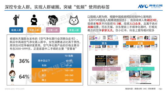 首先,二手煙影響深入人心,不需要重新進行產品教育,其次人口基數較大,2015年中國疾病預防控制中心發布的調查數據顯示,中國成人有超3億人吸煙,第三是這份調查數據同樣顯示,吸煙者人均吸煙15.2根,更是證明抽煙場景極其高頻,最后是相關宣傳較少,京東天貓幾乎沒有相關標簽,抖音和小紅書相對多些。而從需求角度看,根據奧維云網和天貓共同發布的《空氣凈化器行業洞察白皮書》顯示購買中高端空氣凈化器的人群中,女性占比達64%,且學歷越高對空氣凈化器的偏好度越高,而這類人群正是家庭中二手煙的主要“受害者”。