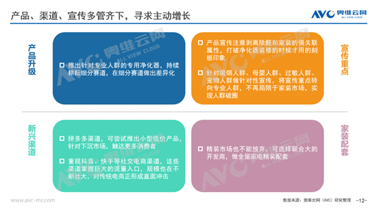 除了人群破圈,在現有市場下我們仍有很多可做之事,產品角度,需要推出針對專業人群的專用凈化器,在細分賽道做出差異化;宣傳角度,注意產品宣傳注意剝離除醛和家裝的強關聯屬性,打破凈化器裝修的時候才用的刻板印象,且針對吸煙人群、母嬰人群、過敏人群、寵物人群做針對性宣傳,將宣傳重點轉向專業人群,不再局限于家裝市場,實現人群破圈;渠道角度,一是重視抖音、快手等社交電商渠道,目標人群減少的情況下,更需要多元的觸及目標客戶,二是針對拼多多等下沉,可嘗試推出小型低價產品,提升產品滲透率,三是精裝市場也不能放棄,可選擇聯合大的開發商,做全屋家電精裝配套。