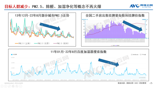 從數據方面也證明,曾經支撐凈化器增長的3個概念PM2.5、除甲醛、加濕凈化,受限于社會環境的變化,也無法支撐凈化器持續上升,主要城市空氣質量自18年起持續改善,二手房交易指數自19年開始也進入下行通道,加濕器搜索指數常年持平且近些年小幅下跌,都導致了凈化器目標人群持續減少。