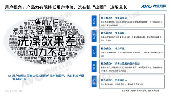 從用戶需求的角度來看,洗鞋機的出現滿足了用戶衣物洗滌之外對于鞋子清洗的需求。但由于目前洗鞋機尚處于普及期,用戶認知尚未建立,用戶更多是抱著嘗試的心態進行購買。并且就購買體驗而言,用戶對于洗鞋機的評價并不一致。用戶好評主要體現為外觀新穎,可以解放雙手等層面,但對于洗鞋效果,多數用戶認為洗滌效果僅為“還算干凈”,更多用戶則認為洗滌效果不理想,并且存在洗滌后鞋面損傷、鞋子內部無法洗滌、鞋帶易纏繞,運行噪音較大,服務層面存在售前、售后體驗不滿意等問題。