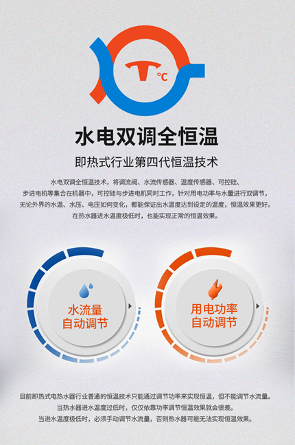 水電雙調全恒溫技術,將調流閥、水流傳感器、溫度傳感器、可控硅、步進電機等集合在機器中,針對用電功率與水量進行自動雙調節,無論外界的水溫、水壓、電壓如何變化,都能保證出水溫度達到設定的溫度,恒溫效果更好。