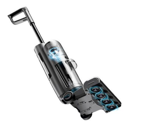 米博無滾布洗地機的清潔模式:采用“水氣旋洗吸一體技術”,通過每分鐘7.3萬轉的高速電機旋轉,將空氣和水混合形成14m/s的高速混合流體,每顆水滴都具有18.8g的強大地面沖擊力。11000Pa的超大吸力,配合水氣旋地刷每秒3000次的高速對地摩擦,形成強勁清潔力,高效去污,并在0.034秒內快速完成廢水回收,地刷速干清爽無殘留。