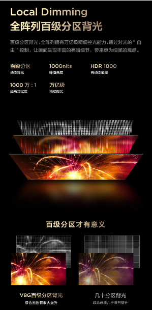 現在擁有好畫質的智能電視,都具有背光分區技術。但是,背光分區技術里的水也很深,因為不同的背光分區數也會影響畫質的好壞。因為每個背光分區的光都可以單獨控制亮暗,所以當電視的分區數越多,單點控制區域就越多,控光就會更精準,畫面細節就會更清晰。行業新發布的《電視畫質分區標準》表明,背光分區數只有幾十級的,畫質的提升都是微乎其微的,到了百級分區,電視畫質會有明顯提升。TCL V8G全系列都有百級背光分區,在同級別產品中的畫質表現,幾乎無人能敵。