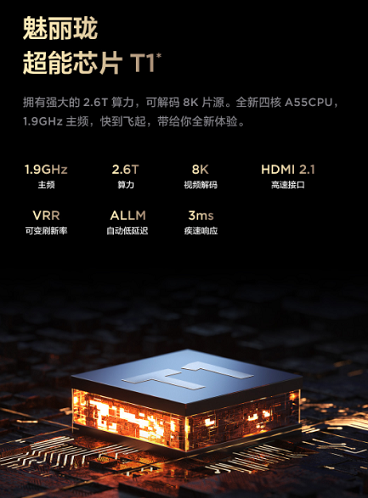 TCL V8G搭載魅麗瓏超能芯片T1(T982機芯),使用的是12nm的制作工藝,支持8K片源解碼,讓4K電視也可以高質量播放8K影視,同時T1的主頻達到1.9GHz,是目前整個電視行業主頻最高的芯片。