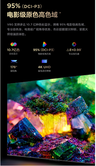 TCL V8G支持10.7億種色彩顯示,擁有95%電影級原色高色域,色準達到△E<0.99。DCI-P3色域是美國電影行業推出的一種衡量影片畫質的一項標準,數值越高,越接近影院真實放映水平。所以TCL V8G的95%(DCI-P3)色域值相對于某信BT.709的色彩表現層次更鮮明,更豐富真實。