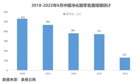 據奧維云網數據顯示,2022年上半年空氣凈化器零售額為21.3億元,同比增加24%,零售量為129萬臺,同比下降29%。事實上,從2018年開始,空氣凈化器的銷售額便出現斷崖式下跌,截止到2022年6月份空氣凈化器產品的跌勢并沒有停止。從目前來看,空氣凈化器市場規模已處于歷史低位。