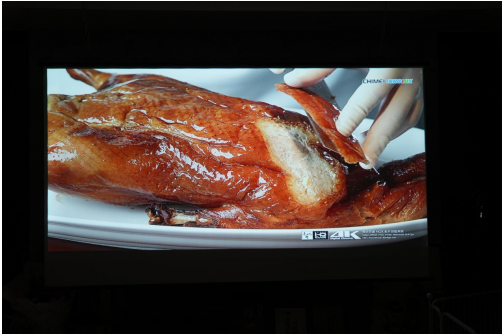 亮度與畫質是選擇一款投影儀的最重要因素,所以在分享它的使用感受之前,把這部分放在了最前面來講。每每上手一個顯示設備,我都會先拿一段4K的演示視頻來感受一下它的畫質如何,這次也不例外,開機先來試試畫質。片源是經典的《4K烤鴨》,我們在商場電視專柜經常會看到這樣的演示視頻,廢話不多說,先來看看實拍圖。