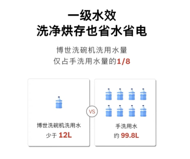 博世家電積極響應國家倡導的綠色發展理念,致力研發綠色節能產品。其最新推出的博世·4系3重盾護洗碗機就擁有一級水效認證,以洗滌12套標準餐具為例,手洗用水量約為99.8L1,而博世洗碗機在節能洗程序下清洗餐具所使用的總用水量少于12L,僅占手洗用水量的1/8。此外,博世洗碗機在省電方面也有著出色的表現,產品一年所節省的電量可供一個25W燈泡正常工作約2774小時,能有效減少居家用電。