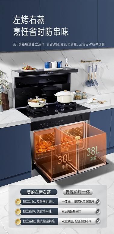 為了提升用戶廚房烹飪體驗,美的深入洞悉用戶需求,憑借深耕廚電行業(yè)多年的過硬實力,創(chuàng)新推出左烤右蒸集成灶LS5,以頂側雙吸技術,滅菌蒸汽洗功能,蒸烤雙腔獨立設計等特點,為用戶健康無油煙下廚提供專屬解決方案。