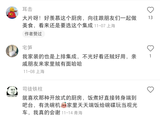 這些用戶自發參與的討論,既說出了自己對于廚房的困擾,也反映了人們對于高品質廚房顏值、社交、功能等全方位的需求,而這恰恰是方太開敞廚房所能解決的痛點。于是,圍繞「生活的萬種想象」這一話題展開討論,讓平臺用戶的注意力集中到了方太開敞廚房的身上,也由此為品牌營造了專屬的溝通場域。