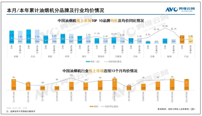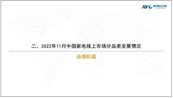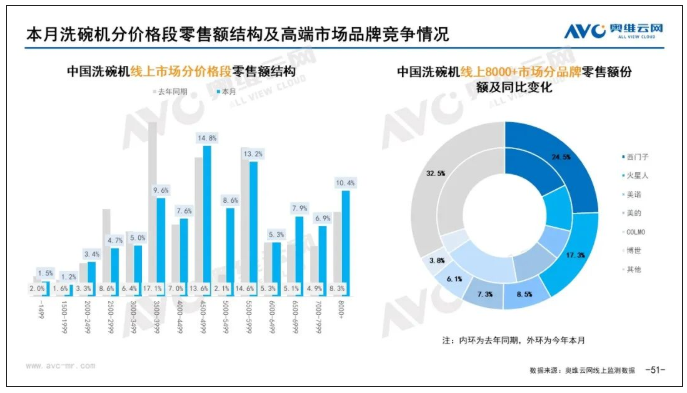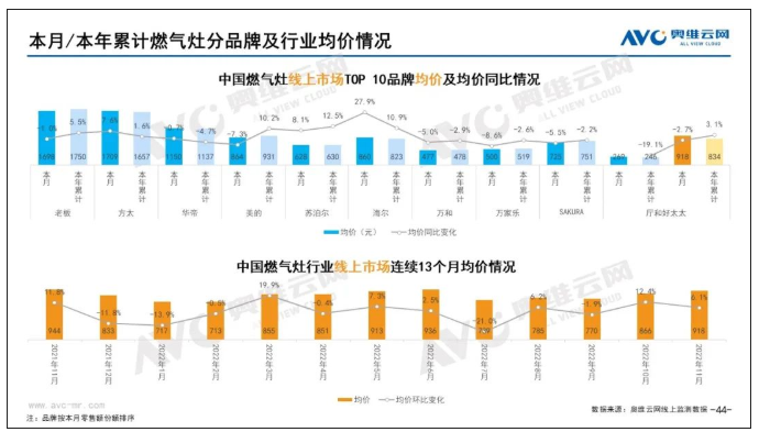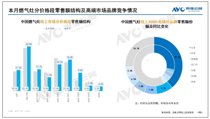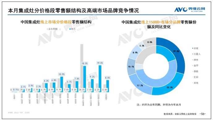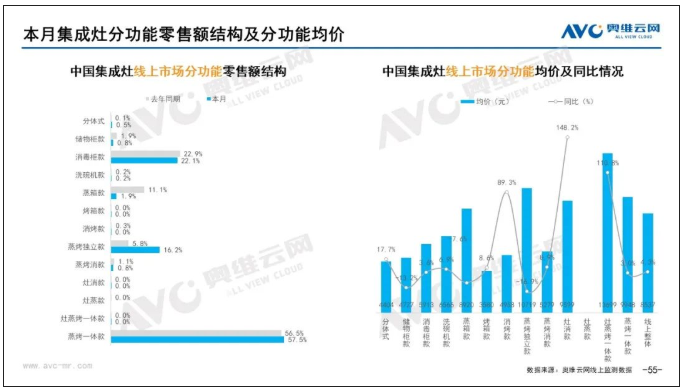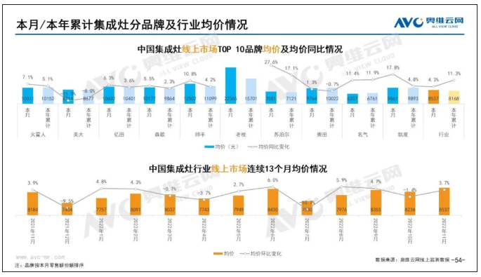 廚衛:據奧維云網(AVC)線上市場監測數據顯示,本月廚衛主要品類中,油煙機、燃氣灶、洗碗機、集成灶、電熱和燃熱的線上零售額規模同比分別為-17.8%、-24.4%、-18.3%、-33.4%、-3.6%和-17.1%;油煙機、燃氣灶、洗碗機、集成灶、電熱和燃熱的均價分別為1695元、918元、4592元、8537元、1062元和1754元,同比分別為0.1%、-2.7%、10.1%、4.3%、-0.2%和-4.1%;各品類中,高端品零售額占比分別為0.9%、2.4%、10.4%、8.5%、0.5%和4.8%,同比分別為-0.6%、-0.5%、2.0%、2.9%、-0.3%和-3.4%。