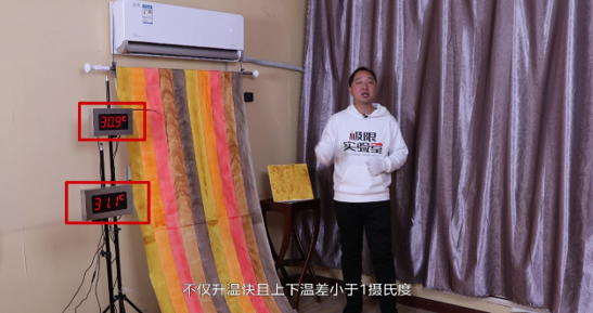 第一、測試開始前,明顯上方的溫度比地面的溫度要高,這說明在冬季暖空氣由于分子運動劇烈,向四周擴散的能力強,因此密度相對于冷空氣會較小,會呈現出上升狀態。因此,這項挑戰對于空調的風道設計有很大的考驗,畢竟只有讓暖風自下而上才能讓升溫更快速、均勻,避免頭熱昏沉足底涼!