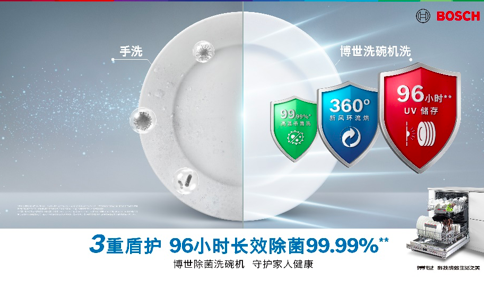 產品應用72℃高溫噴淋技術,經權威機構認證,可有效去除餐具表面99.999%的幽門螺桿菌、99.99%的大腸桿菌、99.99%的金黃色葡萄球菌及99.99%的脊髓灰質炎病毒,無論是日常使用的鍋碗瓢盆,還是對除菌要求極高的嬰兒餐具和玩具,博世·4系3重盾護洗碗機都能以專家級的出色除菌結果守護家人健康,無懼細菌透過餐具傳播,嚴防“病從口入”,為每頓新春佳肴帶來全程凈護。