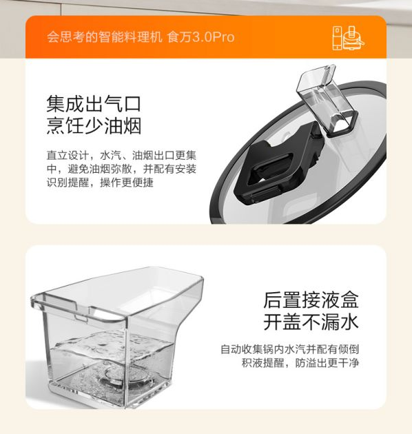 添可食萬3.0 Pro采用清潔電能,不僅比傳統爐灶能節省約39%的熱效率,并且通過采用IH立體控火技術并配合特制懸浮式升降雙翼攪拌鏟,9檔溫度智能調節,可滿足不同食材、烹飪方式,菜肴均勻受熱,鎖住鮮香營養。加之鍋蓋上方專門設計了直立式集成出氣口以及后置接液盒,能夠有效匯聚和收集烹飪中產生的水汽、油煙,避免傳統廚房中的煙熏火燎,尤其是夏天,這一優勢將更加明顯,真正體現了科技以人為本。