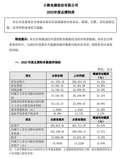 2月16日,經營創意小家電的上市公司小熊電器發布了2022年度業績快報。報告顯示,小熊電器實現2022年全年營收利潤雙增長。營業收入41.15億元,同比增長14.12%;凈利潤3.72億元,同比增長31.21%。小熊電器表示,報告期內公司營業總收入增長,主要系公司做強傳統品類,做大新興品類所致;凈利潤增長,主要系未分配利潤增加所致。
