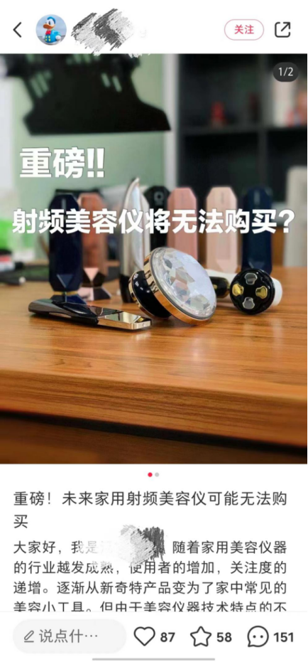 對此,小紅書上有網(wǎng)友表示:還好今年沒買,明年就可以買達到標準的產(chǎn)品了。但是同時也有一些比較有煽動性的內(nèi)容“未來家用射頻美容儀可能將無法購買”,不得不說,“命懸一線”的部分射頻產(chǎn)品可能真的急了。
