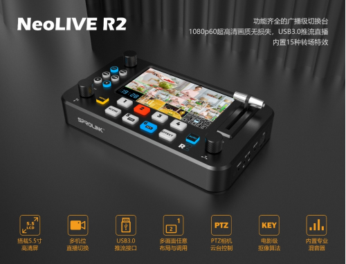 NeoLIVE R2導(dǎo)播切換臺內(nèi)置多種功能,可實現(xiàn)精彩清晰的畫中畫效果,所有NeoLIVE R2直播切換臺都搭載USB接口,可被識別為網(wǎng)絡(luò)攝像頭信號,因此可以使用于任何直播軟件。