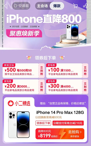 今年的315,蘇寧易購主推的iPhone 14 ProMax價(jià)格直降800元,低至8199元;華為Mate50直降2211元,低至4799元;索尼75英寸4K超清彩電低至9699元;芝華士真皮沙發(fā)低至2999元……