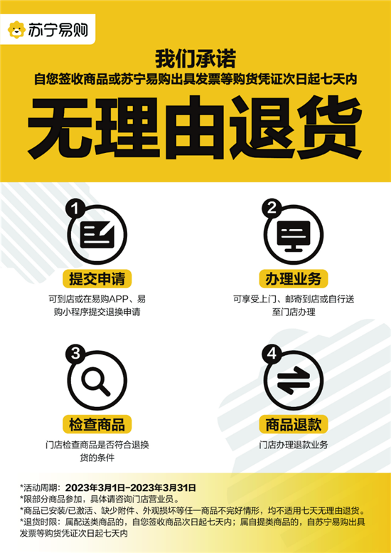 315期間,蘇寧易購服務(wù)保障再升級:自營商品承諾全場景七天無理由退貨。