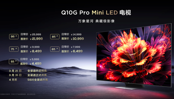 實現了分區翻倍式升級、亮度升級、屏幕升級、音質升級、配置升級、操控升級的TCL Q10G Pro,從發布會所公布的價格來看,這次98/85/75/65/55吋的新品首發驚喜價格僅21999/10999/8499/6499/4499元,與去年Q10G的首發價相比不僅沒有上漲,甚至85吋的還降低了2000元。TCL Q10G Pro實現了質價比的進一步升級,以超出消費者想象的新高度,成為2023年最值得購買的Mini LED電視。