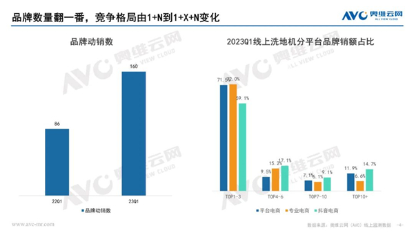 對比去年同期,品牌個數翻了一番,23年Q1品牌動銷數為160個,其中悠尼、米博、以內、馬赫等一眾新品牌進入市場都有不俗表現。品牌競爭格局也發生了變化,呈現1+N到1+X+N的格局轉變,其中添可份額依舊領先,追覓、海爾、美的等品牌也開始發力。