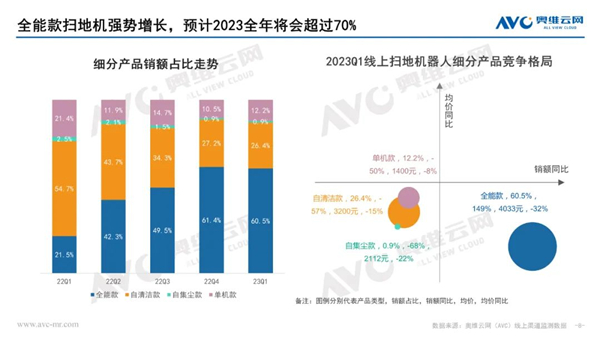 隨著產品升級,拖地需求被徹底激發,帶有自清潔和自集塵功能的全能款掃地機器人呈現飛速發展,2023年1季度,線上全能款銷額占比達到60.5%,在價格進一步下探的趨勢下,全能款產品的比重將會呈現遞增趨勢,預計全年將會達到70%。除了自集塵和自清潔兩個重要功能外,烘干、自動補水、添加清潔液等功能也被逐漸成為標配,機器朝著完全自動化的步伐邁進。
