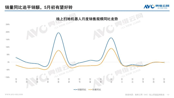 從量額同比月度走勢來看,去年11月份開始量額同比逐漸靠攏,2份額量反超額,預計4月底,五月初量額走勢將會迎來逆轉,隨著新品上市,疊加618的進一步促銷,將會推動掃地機器人放量上漲。