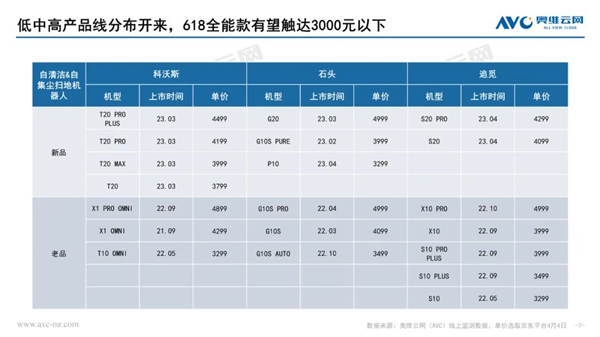 近期,頭部品牌均在3、4月份上了新品,新品較同期而言,性能得到升級,且價格更低,參照以往,大促期間優惠券,疊加老品價格進一步下探,高性價比的全能版掃地機器人將會來到3000元以下,價格下探也帶來更廣泛人群的觸達,但3000-4000仍為核心競爭價格段。