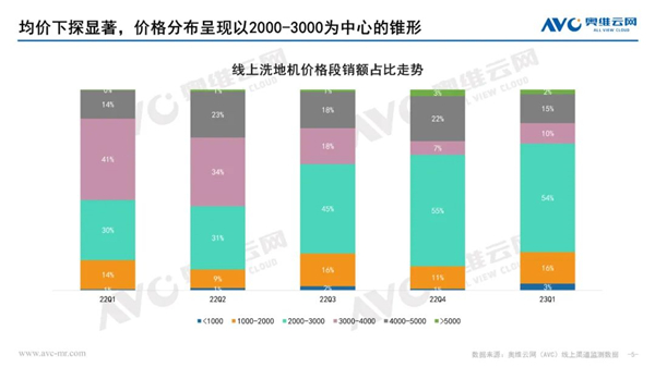 奧維云網(AVC)線上監測數據顯示,洗地機均價由22年一季度2904元下探到23年一季度2496元,同比下降14.1%,價格的下探,激發了購買的需求,對洗地機的銷量有了很好地釋放。從價格段分布來看,2000-3000為核心競爭價格段,占比達到54%,該價格段也將是今年的競爭焦點,2000元以下高性價比產品份額達到19%,長尾品牌以及子品牌在此價格段的競爭會愈發激烈,3000元以上中高端縮水嚴重,占比僅為27%。
