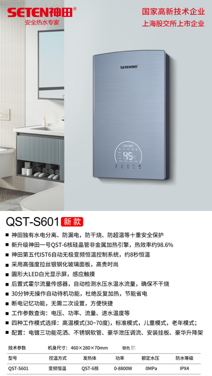 S601的安全性極高,硅晶6核加熱,水電分離,不結(jié)水垢,熱效率高,具備防漏電、防超溫、防超壓、防干燒、故障自檢多種安全保護(hù)。S601也應(yīng)用了智能變頻恒溫、斷電記憶、半小時(shí)無操作自動(dòng)待機(jī)等功能。
