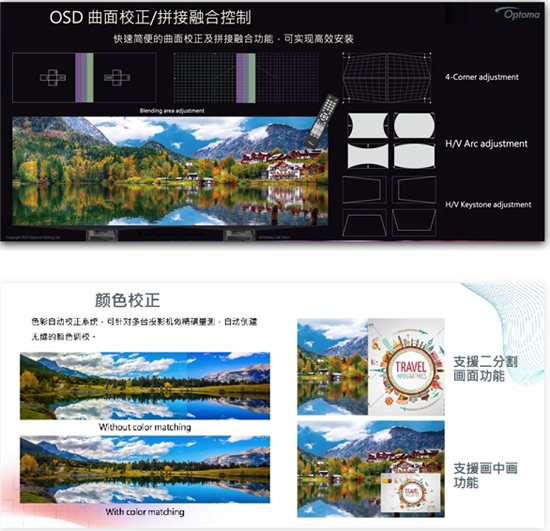 奧圖碼A1-Pro 4K超高清超短焦LED投影機(jī)是新品陣容的C位擔(dān)當(dāng),這款投影對(duì)安裝非常友好,支持TR 0.25電動(dòng)聚焦鏡,同時(shí)進(jìn)行水平垂直±10°梯形校正以及4角校正,3X3變形調(diào)整,即使是復(fù)雜安裝環(huán)境也能帶來(lái)令人滿(mǎn)意的投影效果。