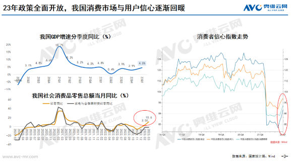 2023年隨著政策的全面開放,我國市場環境逐步回暖,今年一季度GDP同比增速提至4.5個百分點,3月社零同比亦高達10.6%。同時我們也看到消費者信心逐漸回暖之勢。(了解更多家電數據,請點擊“奧維數據羅盤”)