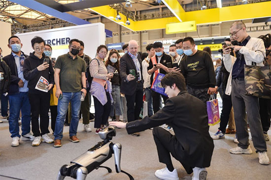 得益于搭載了12組高性能伺服電機、21TOPS澎湃算力及多種傳感器,Eame One二代可完成爬坡、上樓梯、跨越障礙、跳舞等高難度動作,并且能精準判斷多種地形,適應復雜環境。仿生四足機器狗Eame One二代精彩互動引來現場諸多現場觀眾打卡圍觀。