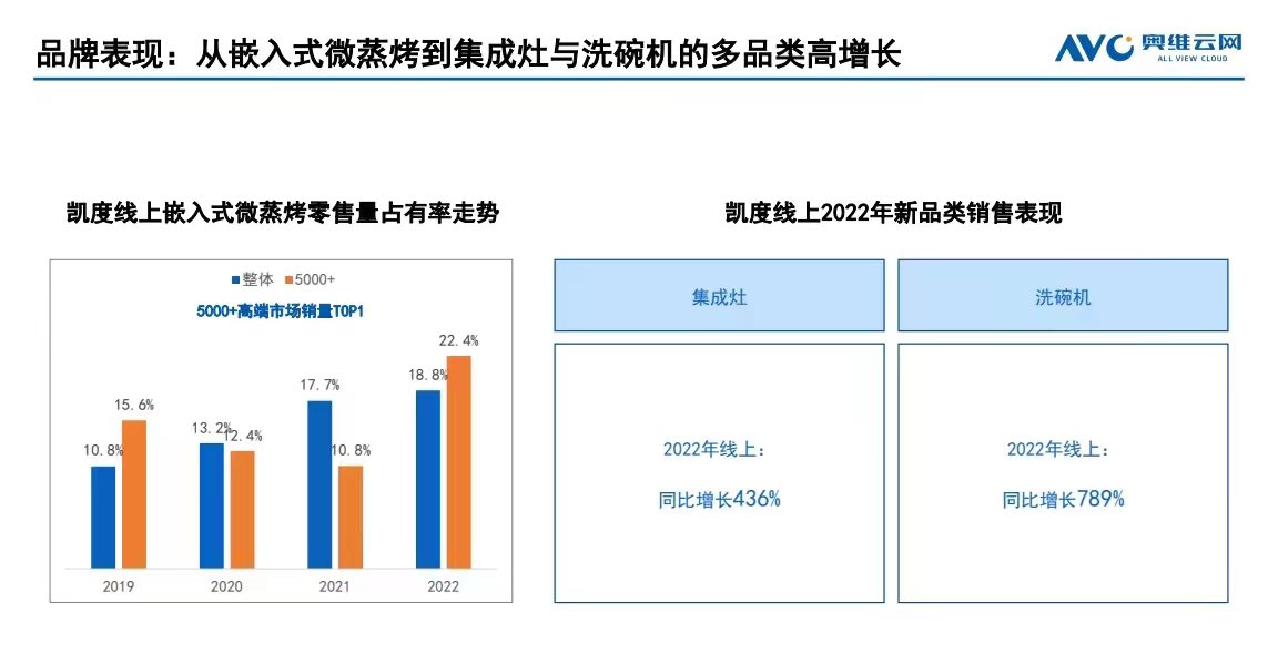 而這樣的創新方式和產品賦能也獲得了消費者的認可。來自奧維云網的數據顯示,2022年線上市場,凱度集成灶和洗碗機同比分別增長了436%和789%。嵌入式微蒸烤產品中有4款進入線上TOP10,SR6028FE13-ZDPRO嵌入式微蒸烤品類線上銷額TOP1,5000元以上嵌入式市場中,凱度銷量第一。