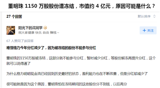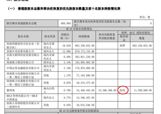 按照5月4日收盤的每股35.42元計算,董明珠遭凍結的股份市值高達4.07億元。