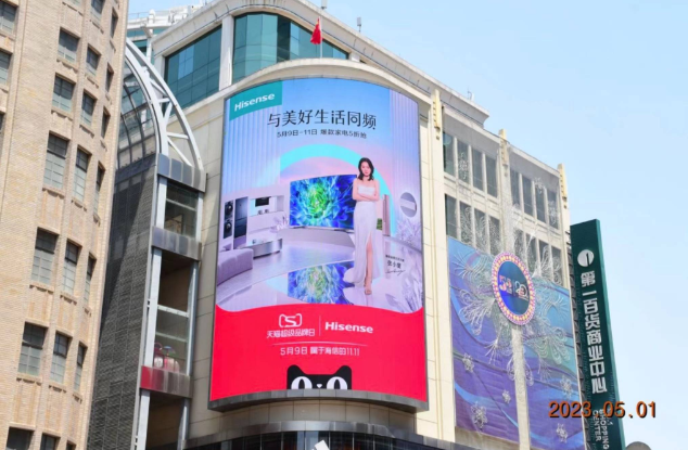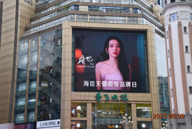 上海第一百貨、成都太古里、重慶解放碑、杭州武林銀泰、南京新街口等熱門地標大屏均被海信品質生活大使張小斐和海信天貓超級品牌日的明星產品們占據了視覺中心。海信用最簡單直接的方式,預告了5月9日上線的海信天貓超級品牌日。進一步拉近與用戶的距離,除線上話題及互動外,增加了與用戶溝通的觸點,達成與更多受眾的深度鏈接。