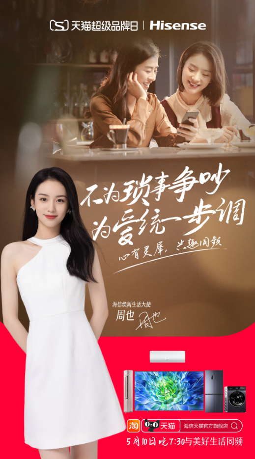 為了同新世代消費人群深入溝通,這次海信為天貓超級品牌日史詩級匹配了三個明星作為同頻觀察員。海信品質生活大使張小斐,以及海信煥新生活大使周也、知名籃球解說楊毅同時加盟,傳達與美好生活同頻的主張。通過詮釋演繹親情、愛情、友情中遇到的不同頻問題,引發人們的思考與共鳴。放大海信的產品角色,在家電的助力下實現同頻的美好生活。這些不同親密關系的情感演繹,將活動理念和海信產品特點傳遞給更多人,號召大眾一起來探尋與美好生活同頻的秘密。