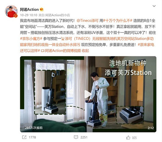 原創(chuàng)視頻博主“阿諾Action”則通過視頻全方位展示洗地機新物種添可芙萬Station的獨特魅力,另辟蹊徑從品牌理念和創(chuàng)新科技的角度對產品進行了更深層次的解讀,“自動上下水,不倒污水不臟手”、“拿起就能用,放下不用管”,讓許多粉絲和路人都被“種草”。