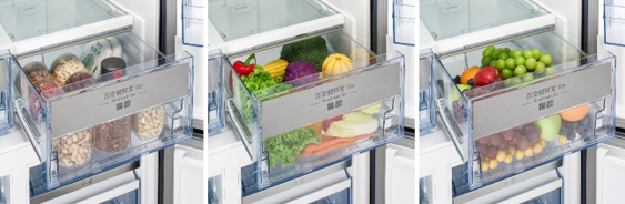 其冷藏區中特別設計有可三檔變溫的百變儲鮮抽屜,以滿足全家人多種多樣的食材存儲需求。不論是母嬰食物,果蔬干貨,還是太太的面膜,老人的中藥滋補品,都可以找到最佳的存儲狀態。