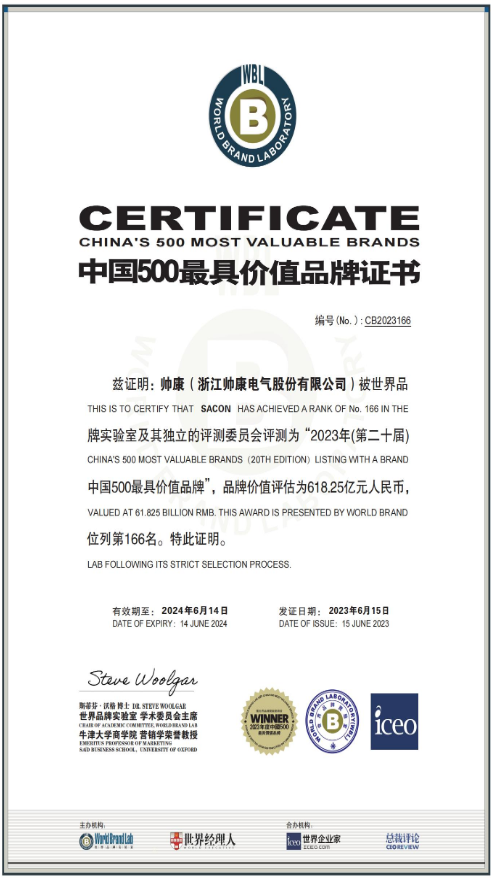2023年6月15日,由世界品牌實(shí)驗(yàn)室和世界經(jīng)理人聯(lián)合主辦的第二十屆世界品牌大會(huì)在北京隆重舉行,會(huì)上發(fā)布了2023年度(第20屆)“中國(guó)500最具價(jià)值品牌”榜單。作為中國(guó)第一代廚電頭部品牌,帥康以618.25億元的品牌價(jià)值連續(xù)16年強(qiáng)勢(shì)入選榜單,位列榜單166位,在專(zhuān)業(yè)廚電品牌中位居前列,品牌領(lǐng)跑地位得到行業(yè)內(nèi)外的廣泛認(rèn)可。