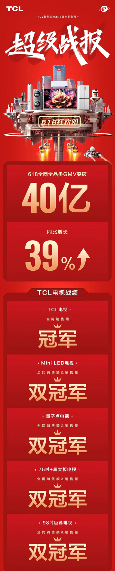 在618京東Mini LED電視的單品銷量榜,TCL電視就以近乎“屠榜”的架勢,占據了銷量榜前十名中的八位,排行榜中前五名均是TCL的爆款型號,而在整個618期間,TCL的整體電視銷量表現也是相當驚人的,TCL全網全品類GMV突破40億,同比增長39%,其中TCL電視全網銷售額冠軍;Mini LED電視全網銷售額&銷售量、雙冠軍;量子點電視全網銷售額&銷售量雙冠軍;75時+超大板電視全網銷售額&銷售量雙冠軍;98時巨幕電視全網銷售額&銷售量雙冠軍,這也足見TCL在電視領域表現得成功。